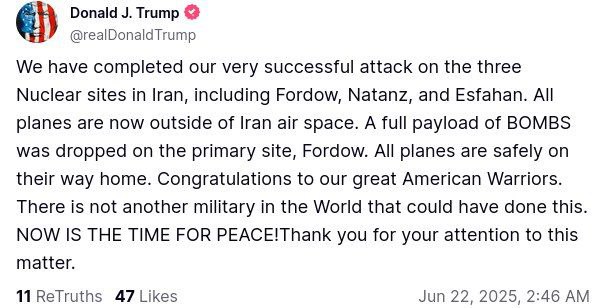 به گزارش سایت طلا،رییس جمهور آمریکا نوشت: ما حمله بسیار موفق خود را به سه سایت هستهای در ایران، شامل فردو، نطنز و اصفهان، به پایان رساندیم. تمام هواپیماها اکنون از حریم هوایی ایران خارج شدهاند. یک محموله کامل از بمبها بر روی سایت اصلی، یعنی فردو، رها شد. تمام هواپیماها در مسیر بازگشت به خانه هستند و در امنیت کامل به سر میبرند. تبریک به جنگجویان بزرگ آمریکاییمان. هیچ ارتش دیگری در جهان نمیتوانست چنین کاری انجام دهد. اکنون زمان صلح فرا رسیده است! سپاس از توجه شما به این موضوع.