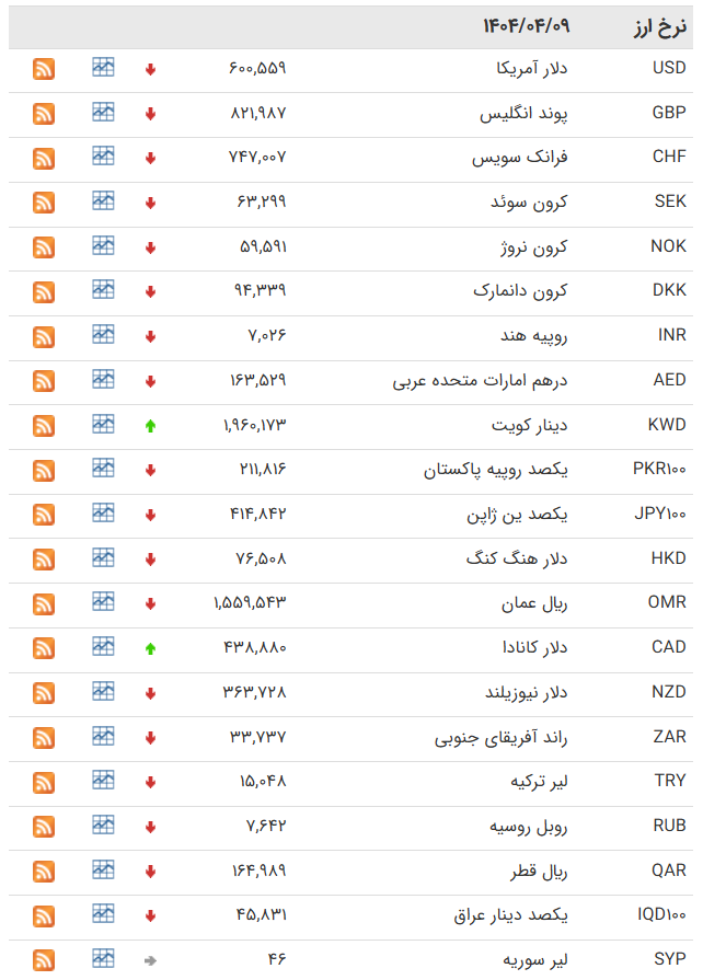 در معاملات امروز (دوشنبه 9 تیر ماه ۱۴۰۴) مرکز مبادله ارز و طلای ایران قیمت دلار 24 تومان گران شد در حالی که قیمت یورو 168 تومان ارزان شد.