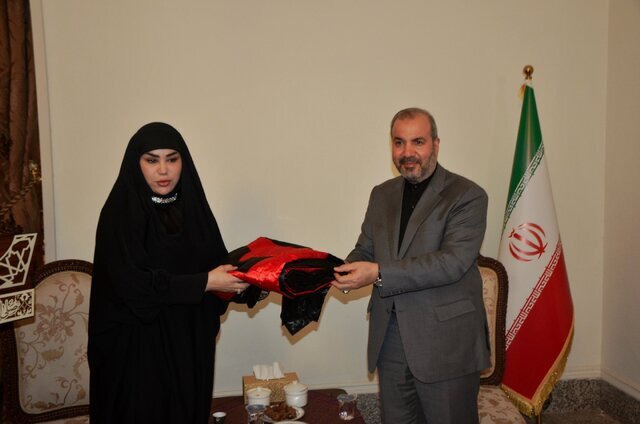 خانم «امطار رحیم المیاحی» معاون رئیس هیئت عالی رسانه و ارتباطات عراق با تقدیر از «سحر امامی» مجری شبکه خبر ، پرچم حرم مطهر اباعبدالله الحسین «ع» و لوح تقدیر از وی را به محمدکاظم آل صادق سفیر جمهوری اسلامی ایران در عراق تقدیم کرد.