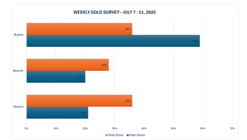این هفته، ۱۴ تحلیلگر در نظرسنجی طلای کیتکو نیوز شرکت کردند و وال استریت پس از عملکرد ثابت در طول هفته، موضعی نسبتاً خنثی اتخاذ کرد. پنج متخصص یا ۳۶ درصد انتظار داشتند که قیمت طلا در طول هفته پیش رو افزایش یابد، در حالی که چهار تحلیلگر یا ۲۸ درصد پیشبینی کاهش قیمت را داشتند. پنج تحلیلگر باقی مانده، که ۳۶ درصد را تشکیل میدهند، پیشبینی کردند که فلز زرد هفته آینده در روندی خنثی معامله خواهد شد.