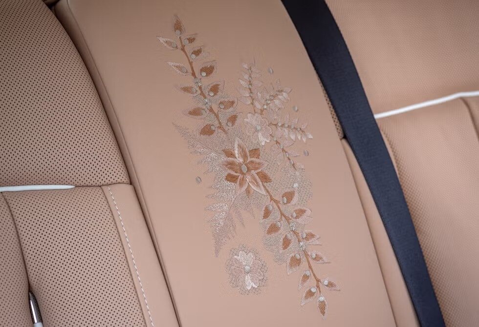 سرنشینان عقب نیز شاهکار خود را دارند، با مجموعهای دیگر از گلهای ظریف که فضای بین صندلیهای عقب را تزئین میکنند و ۷۰ هزار ذوخت نیاز داشتهاند. همانند نشان روی کاپوت، روی بلندگوها نیز با طلای رزگلد تکمیل شدهاند.