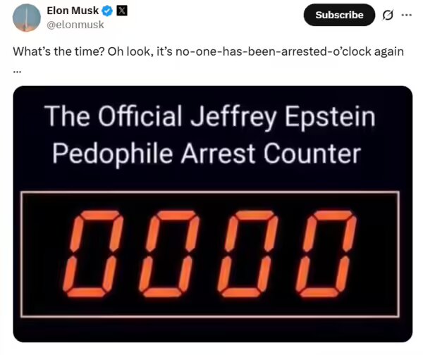 ماسک امروز (دوشنبه) تصویری طنز منتشر کرد که به گفته او «شمارشگر رسمی بازداشتها در پرونده اپستین» نام دارد و عدد «۰» را نشان میدهد. او در توضیح این عکس نوشت: «اکنون وقت چیست؟ اوه، وقت اینکه باز هم هیچ کس را بازداشت نکنیم!»