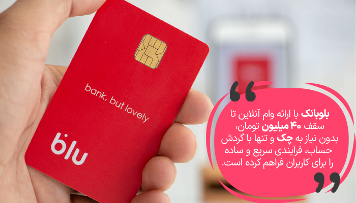 بلو بانک به افراد واجد شرایط بدون نیاز به ضامن و به‌صورت آنلاین وام پرداخت می‌کند. برای دریافت وام از این سامانه باید حداقل به‌مدت ۳ ماه حساب‌تان فعال باشد، علاوه بر این، سیستم قبل از تأیید درخواست، اعتبارسنجی نیز انجام می‌دهد.