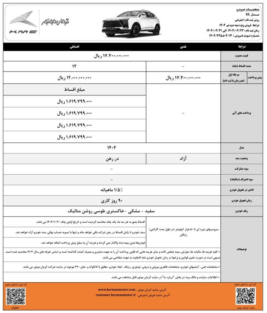 مرحله جدید فروش خودرو کی ام سی ایکس5 به صورت نقدی و اقساطی از فردا دوشنبه 23 تیرماه 1404 به صورت اینترنتی بر روی سایت فروش شرکت کرمان موتور فعال خواهد شد.