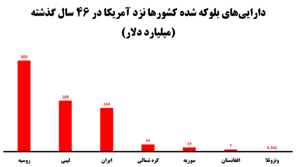 روسیه با ۳۰۰ میلیارد دلار و ونزوئلا با ۳۴۷ میلیون دلار صدر و ذیل فهرست داراییهای مسدود شده کشورها نزد آمریکا هستند، ایران هم ۱۳۲ میلیارد دلار دارایی مسدود شده نزد آمریکا دارد.
