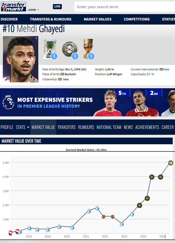 به گزارش سایت طلا،مهدی قائدی، مهاجم تیم ملی ایران بنا به گزارش سایت ترانسفرمارکت با افزایش قیمت ۳ میلیون یورویی در عرض یک سال «بیشترین رشد را در میان فوتبالیستهای ایران» به نامش ثبت کرده است.