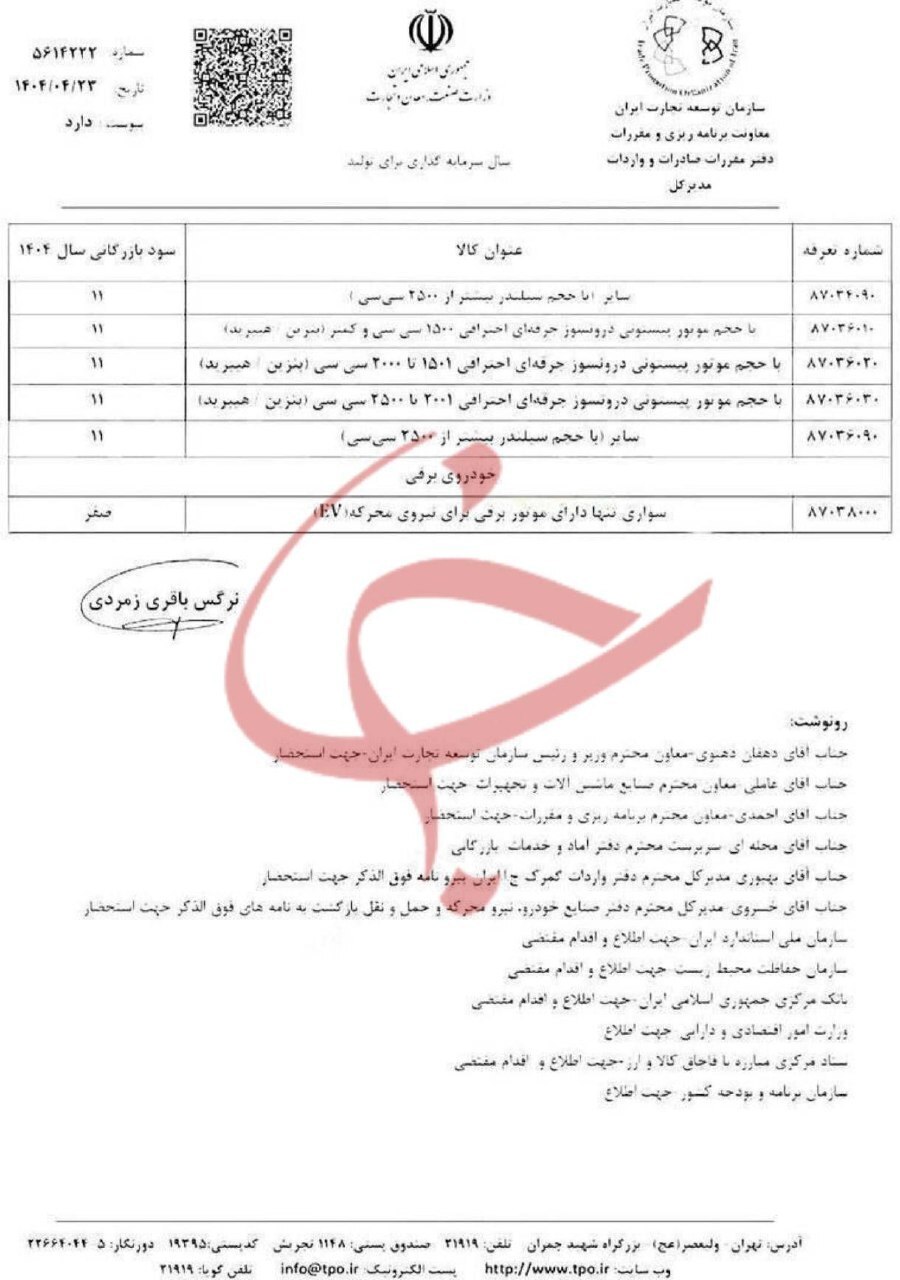 پیرو رونوشت نامه شماره ۵۴۸۰۷۴۸ مورخ ۱۴۰۴/۴/۰۱ موضوع ابلاغ تصویب نامه شماره ۵۰۷۰۳ ت ۶۳۸۸۱ هـ مورخ ۱۴۰۴/۰۳/۲۱ هیات محترم وزیران در خصوص آیین نامه اجرایی بند (ز) تبصره (۱) ماده واحده قانون بودجه سال ۱۴۰۴ کل کشور برای واردات انواع خودرو در سال ۱۴۰۴ ضمن ارسال تصویر نامه های شماره ۵۵۴۰۴۲۵ مورخ ۱۴۰۴/۴/۰۹ و شماره ۵۶۰۱۵۵۱ مورخ ۱۴۰۴/۴/۲۱ دفتر صنایع خودرو خواهشمند است دستور فرمایید سود بازرگانی انواع خودروهای بنزینی وارداتی موضوع تبصره (۱) ماده (۵) و همچنین انواع خودروهای برقی و خودروهای هیبریدی ( HEV-PHEV) موضوع ماده (۸) مصوبه یاد شده، در سامانه جامع تجارت و سایر سامانه های مرتبط صرفا تا پایان سال ۱۴۰۴ به شرح جدول ذیل اصلاح گردد.