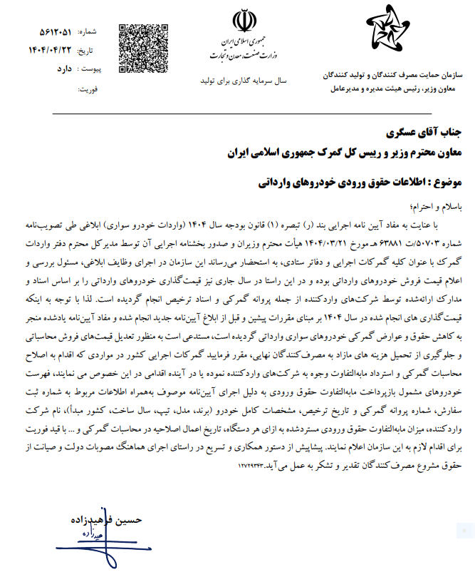 همچنین در نامه حسین فرهید زاده رئیس سازمان حمایت مصرف کننده و تولیدکننده به فرود عسگری رئیس گمرک آمده است: با توجه به مفاد آیین نامه اجرایی بند (ر) تبصره (۱) قانون بودجه سال ۱۴۰۴ واردات خودرو سواری ابلاغی طی تصویب نامه شماره ۵۰۷۰۳/ت ۶۳۸۸۱ هـ مورخ ۱۴۰۴/۰۳/۲۱ هیأت وزیران و صدور بخشنامه اجرایی آن توسط مدیر کل دفتر واردات گمرک با عنوان تمام گمرکات اجرایی و دفاتر ستادی، به استحضار می رساند این سازمان در اجرای وظایف ابلاغی، مسئول بررسی و اعلام قیمت فروش خودروهای وارداتی بوده و در این راستا در سال جاری نیز قیمتگذاری خودروهای وارداتی را بر اساس اسناد و مدارک ارائه شده توسط شرکت های وارد کننده از جمله پروانه گمرکی و اسناد ترخیص انجام شده است.