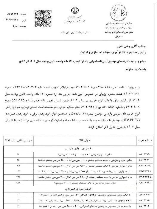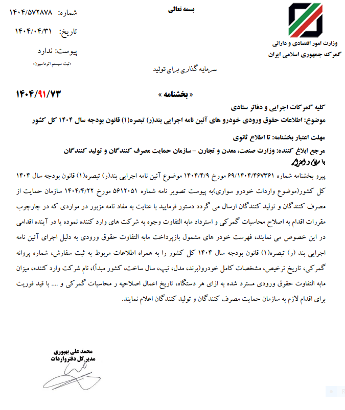 در بخش دیگر این نامه آمده است: لذا با توجه به اینکه قیمتگذاری های انجام شده در سال ۱۴۰۴ بر مبنای مقررات پیشین و قبل از ابلاغ آیین نامه جدید انجام شده و مفاد آیین نامه یادشده منجر به کاهش حقوق و عوارض گمرکی خودروهای سواری وارداتی شده، مستدعی است به منظور تعدیل قیمت های فروش محاسباتی و جلوگیری از تحمیل هزینه های مازاد به مصرف کنندگان نهایی مقرر فرمایید گمرکات اجرایی کشور در مواردی که اقدام به اصلاح محاسبات گمرکی و استرداد مابه التفاوت وجوه به شرکت های وارد کننده کرده یا در آینده اقدامی در این خصوص می کند، فهرست خودروهای مشمول بازپرداخت مابه التفاوت حقوق ورودی را اعلام کند.