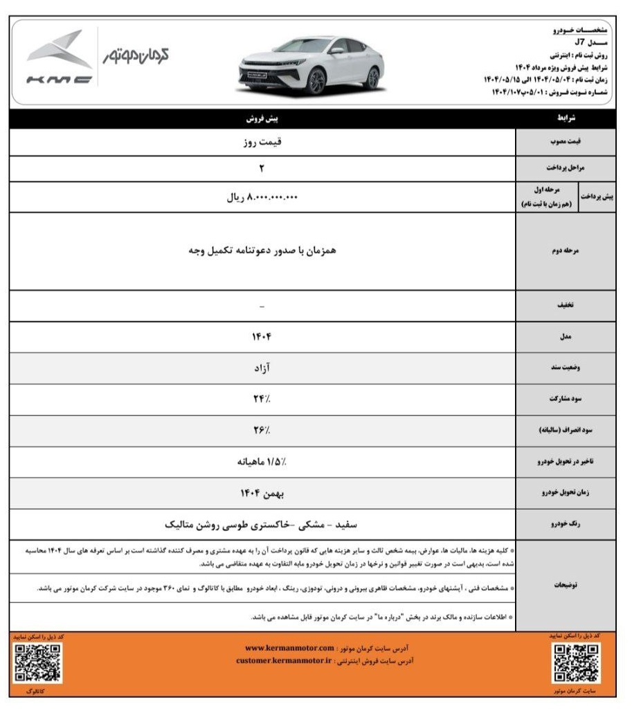 شرایط طرح پیش فروش کرمان موتور مرداد 1404 اعلام شد.