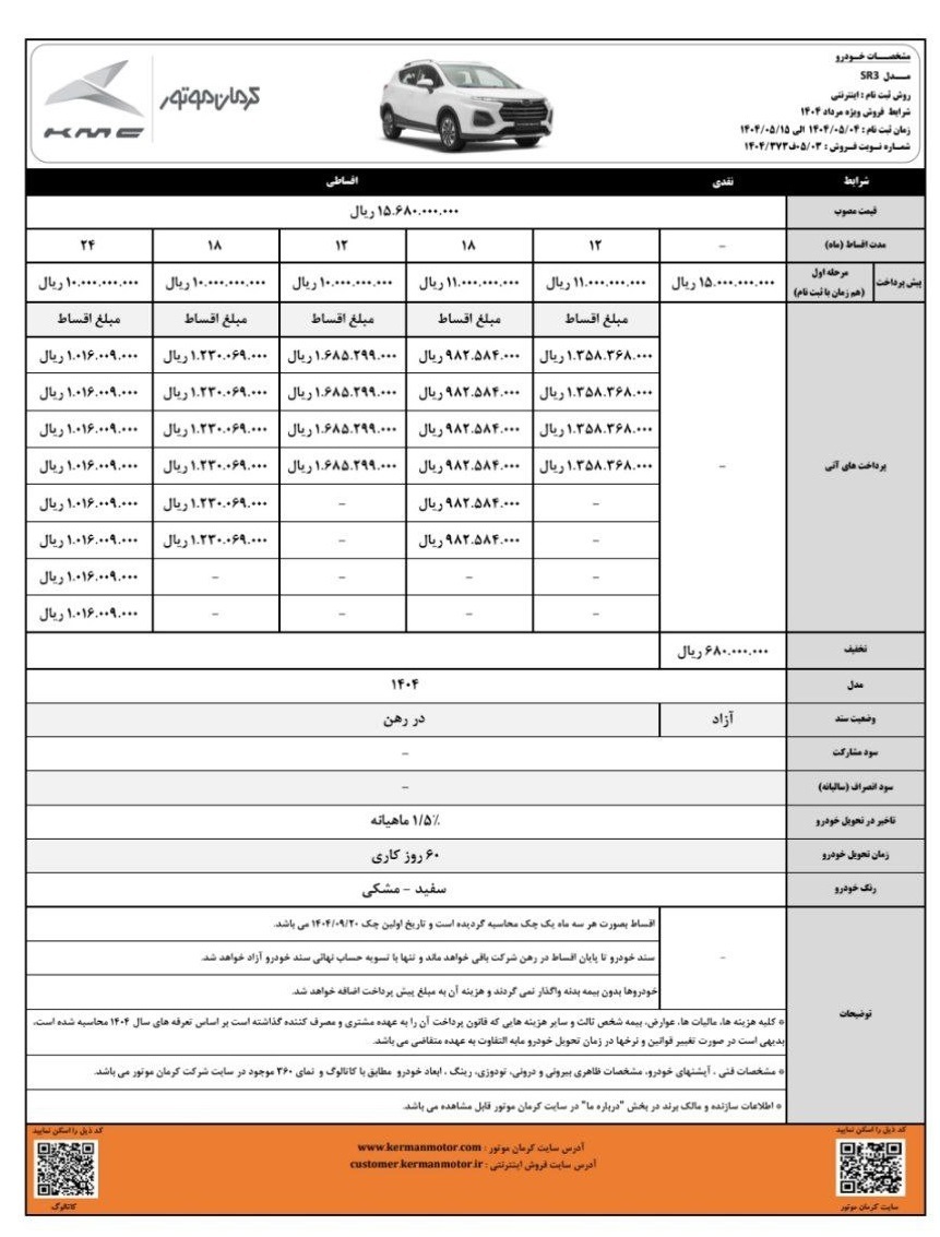 شرایط طرح فروش کرمان موتور مرداد 1404: