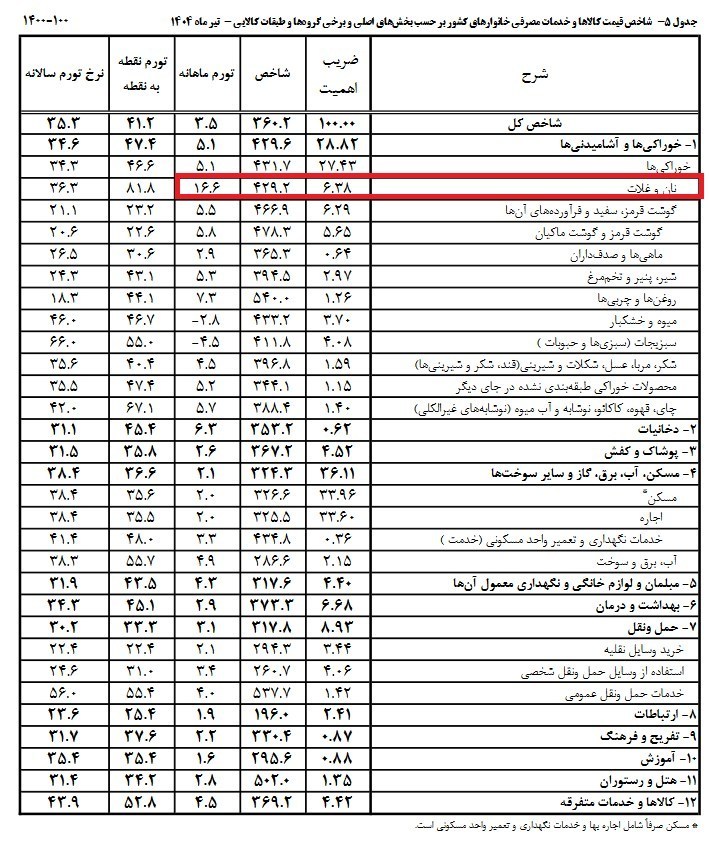 شاخص قیمت کالا و خدمات مصرفی خانوارها بر حسب بخشهای اصلی و برخی گروهها و طبقات کالایی نشان میدهد در تیر ماه گروه نان و غلات تورم ماهانه 16.6 درصدی را ثبت کرده است.تورم ماهانه گروه خوراکیها نیز 5 درصد بوده است.این درحالی است که در تیر ماه تورم ماهانه کل 3.5 درصد بوده است. لازم به ذکر است در تیر ماه تورم ماهانه گروه سبزیجات منفی 4.5 درصد بوده است. همچنین گوشت قرمر نیز تورم ماهانه 5.8 درصدی را ثبت کرده است.