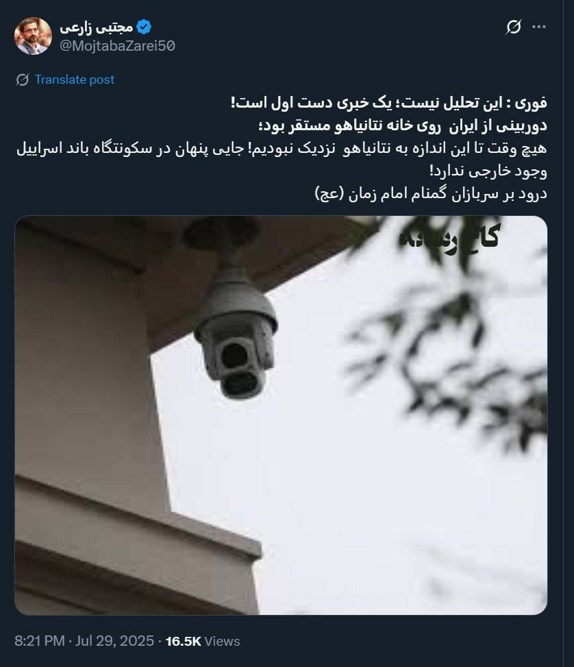 [ادعای عجیب یک نماینده مجلس : در خانه نتانیاهو دوربین داشتیم!] مجتبی زارعی نوشت: دوربینی از ایران روی خانه نتانیاهو مستقر بود.