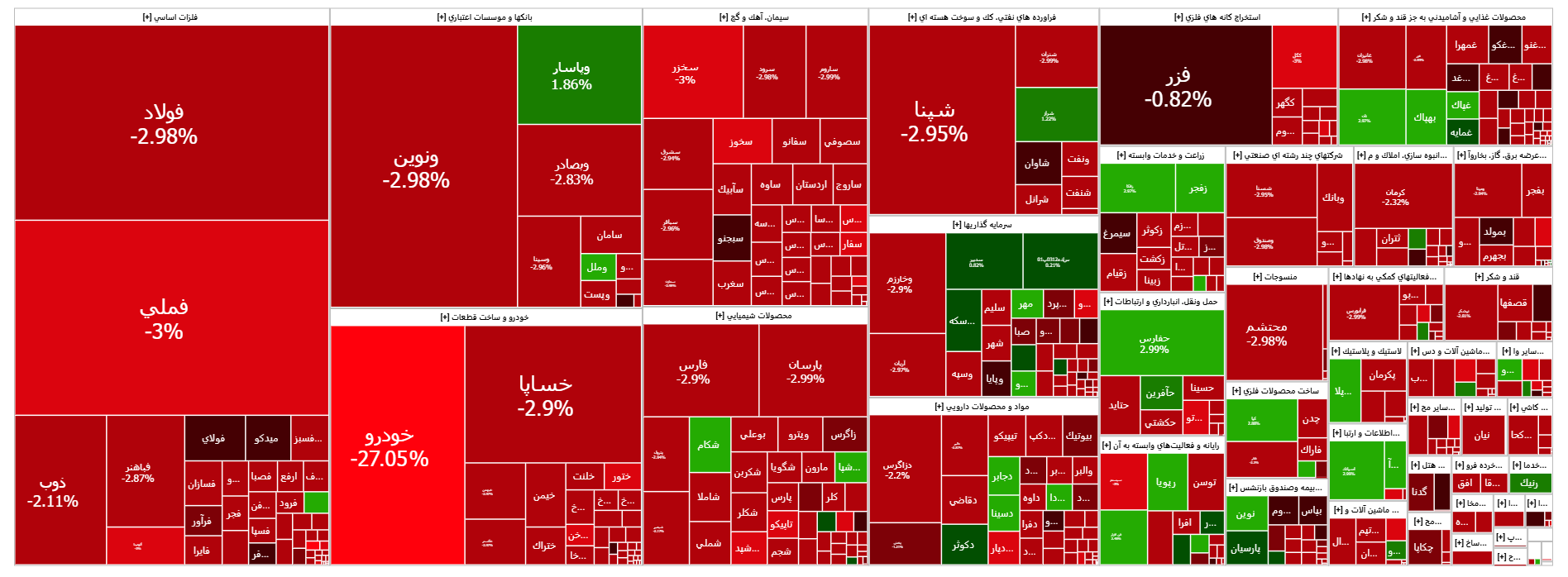 در این روز به ترتیب نمادهای فولاد، فارس، فملی و خودرو بیشترین تاثیر منفی را بر شاخص کل بازار سرمایه داشتند و عامل افت بازار سرمایه شدند.