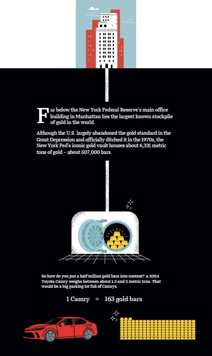 چطور میتوان وزن نیم میلیون شمش طلا را توضیح داد؟ یک تویوتای کمری مدل ۲۰۲۴، بین ۱.۵ تا ۲ تن وزن دارد؛ بنابراین میتوان گفت که خزانه فدرال رزرو، پارکینگ بزرگی مملو از تویوتا کمری است!