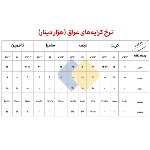 نرخهای کرایه از مرزهای ایران تا شهرهای زیارتی عراق + جدول