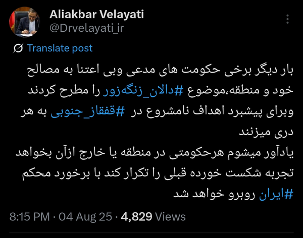 به گزارش سایت طلا،علی اکبر ولایتی مشاور امور بینالملل رهبر انقلاب در شبکه اجتماعی ایکس نوشت: بار دیگر برخی حکومت های مدعی وبی اعتنا به مصالح خود و منطقه،موضوع دالان زنگهزور را مطرح کردند وبرای پیشبرد اهداف نامشروع در قفقاز جنوبی به هر دری میزنند.