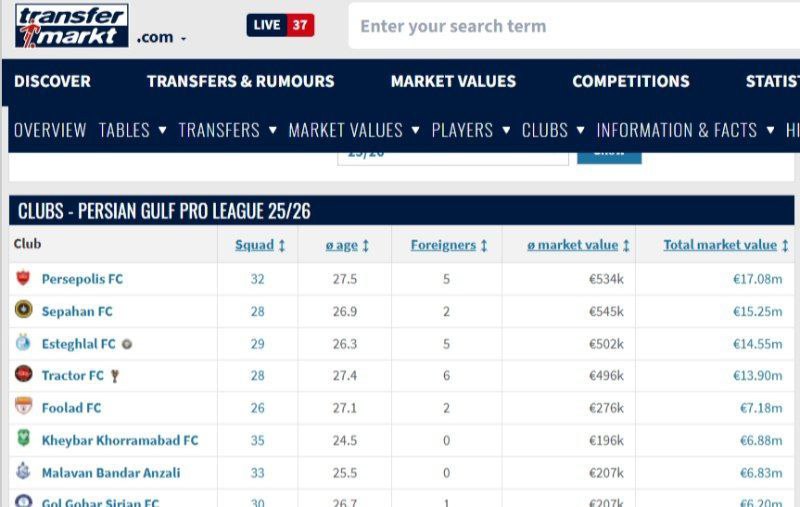 بر اساس آخرین آمار وبسایت «ترانسفرمارکت»، پرسپولیس با ارزش کل ۱۷ میلیون یورو گرانترین تیم لیگ برتر ایران است. سه نفر از پنج بازیکن ارزشمند لیگ در ترکیب پرسپولیس حضور دارند که نقش مهمی در این صدرنشینی داشته است. سپاهان با ۱۵ میلیون یورو دوم است و جذب ریکاردو آلوز پرتغالی به افزایش ارزشش کمک کرده است. استقلال با ۱۴ میلیون و تراکتور با ۱۳ میلیون یورو در ردههای سوم و چهارم قرار دارند.