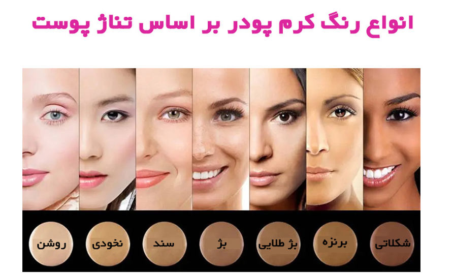 رنگ کرم پودر باید با تناژ پوست سازگار باشد تا ظاهر طبیعی داشته باشد. از طرفی، رنگ آن باید از غلظت کافی برای پوشاندن نواقص پوست برخودار باشد. برای انتخاب رنگ کرم پودر، ابتدا باید تناژ پوستی خود را مشخص کنید.