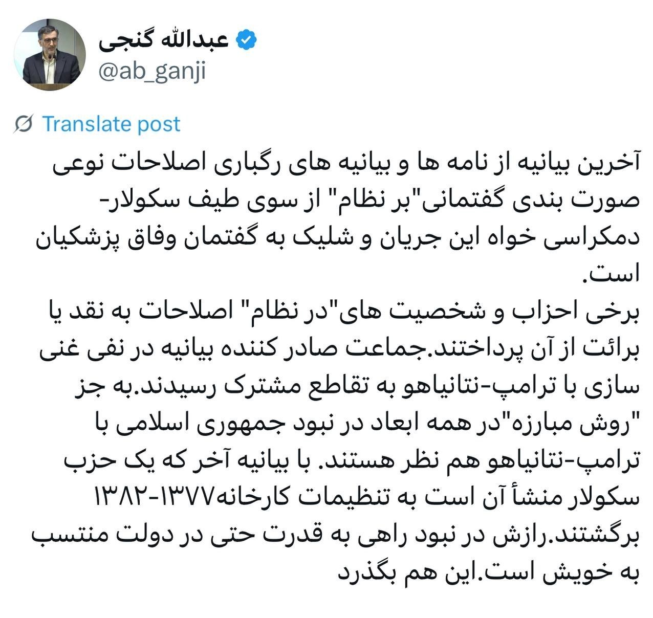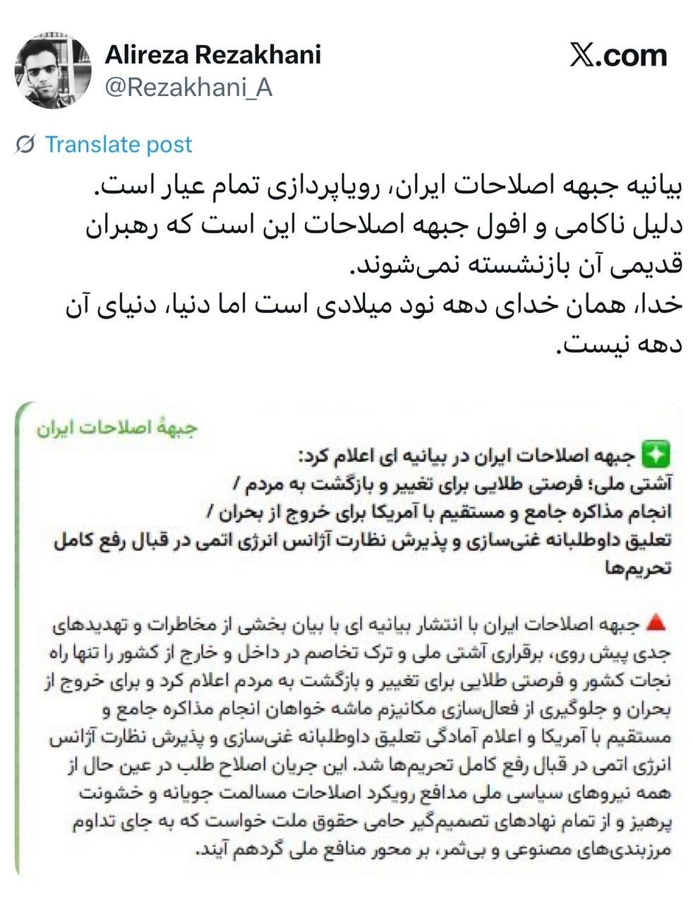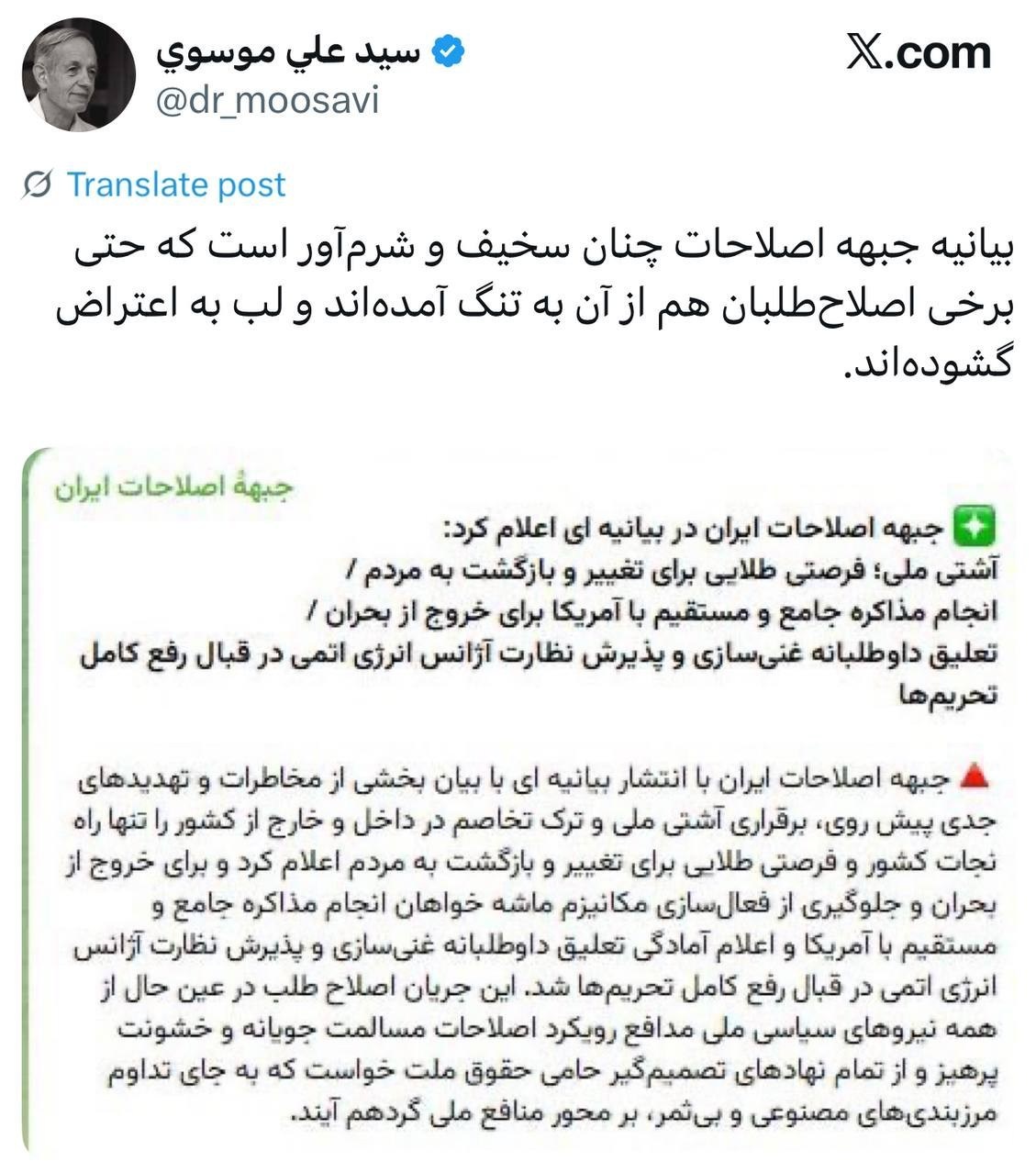 بیانیهای که با واکنشهای متعددی از جمله خود اهالی اصلاحات مواجه شده و صدای خیلیها را در آورده است. این بیانیه غیر از اینکه در واقع شبیه مواضع رسمی اسرائیلیها بود، شلیکی به وفاق پزشکیان هم محسوب میشود.