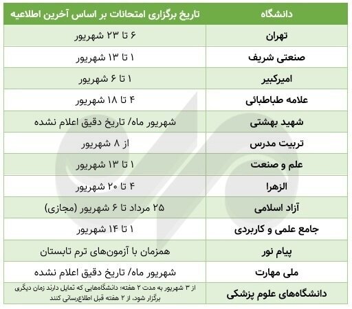 دانشگاه تهران: طبق اطلاعیه جدید معاونت دانشجویی این دانشگاه زمان بازگشایی خوابگاهها اول شهریور است. همچنین طبق اطلاعیه معاونت آموزشی این دانشگاه زمان انتخاب واحد در فاصله ۲۲ تا ۲۸ شهریور خواهد بود و بازه زمانی اخذ و گذراندن دروس به صورت تکدرس برای دانشجویان واجد شرایط، از تاریخ ۲۴ شهریور تا ۱۲ مهر است.