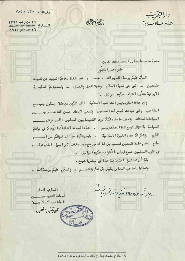 گروه تقریب مذاهب اسلامی، متشکل از علمایی از همه مذاهب فکری، برای اتحاد مسلمانان تلاش میکند، به دنبال ایجاد تفاهم خوب بین فرقههای مختلف است و سخت تلاش میکند تا شکاف بین مسلمانانی که به دلیل سیاست از هم جدا شدهاند، افزایش نیابد و شکاف بین آنها همچنان گسترش نیابد. این گروه بدون شک از موضع والای شما حمایت میکند و از این غیرت اسلامی شما سپاسگزار است. تشکر ما نه تنها به خاطر نور مثبتی است که موضع شما برای خدمت به آرمان فلسطین به ارمغان آورده است، بلکه به خاطر تأثیر خوبی است که داشته و اثر منفی شتاب ایران در به رسمیت شناختن دولت اسرائیل را در قلب مسلمانان کاهش داده است. میتوانید اعتراض ما را در مجلس سنا اعلام کنید.