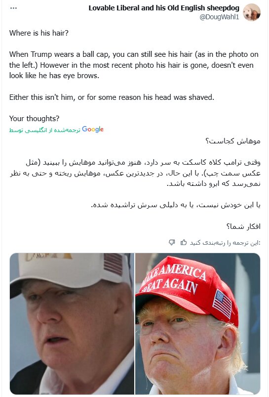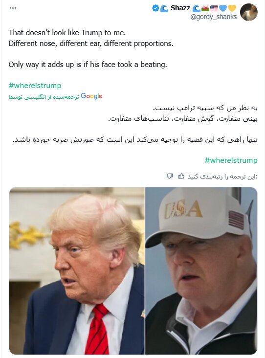 حتی کار به جایی کشیده که برخی از کاربران مطرح میکنند که چهره جدیدی که از ترامپ منتشر شده است، وی نیست! گفته شده که تنها راه توجیه اینکه تصویر جدید از ترامپ که خود اوست این است که به صورتش ضربه شدیدی خورده است.