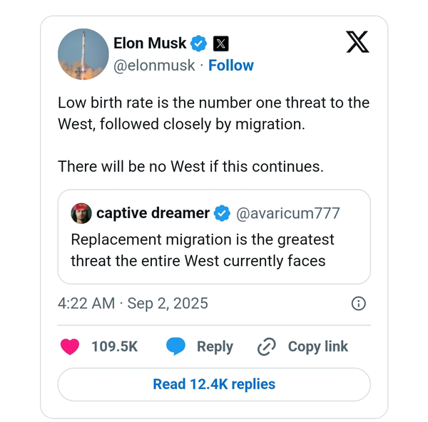ماسک با به اشتراک گذاشتن پستی از یک کاربر اینترنت در این مورد نوشت: نرخ پایین زاد و ولد تهدید شماره یک برای غرب است و پس از آن مهاجرت (از کشورهای غیرغربی) تهدید دوم است. اگر این روند ادامه یابد، غربی وجود نخواهد داشت.