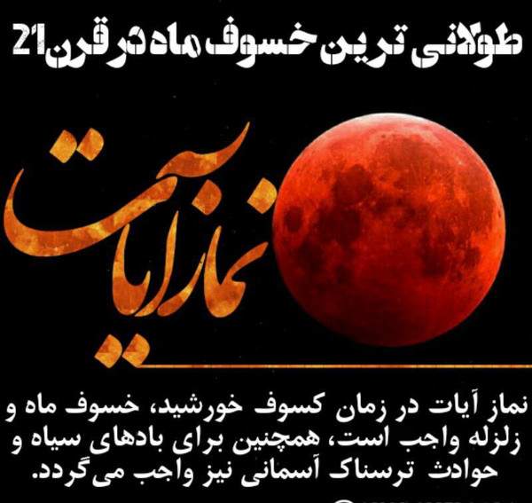 این پدیده تصویری زیبا از ماه خونین رنگ را در دل آسمان سیاه شب به نمایش خواهد گذاشت. بر همی اساس بر همگان خواندن نماز آیات واجب است