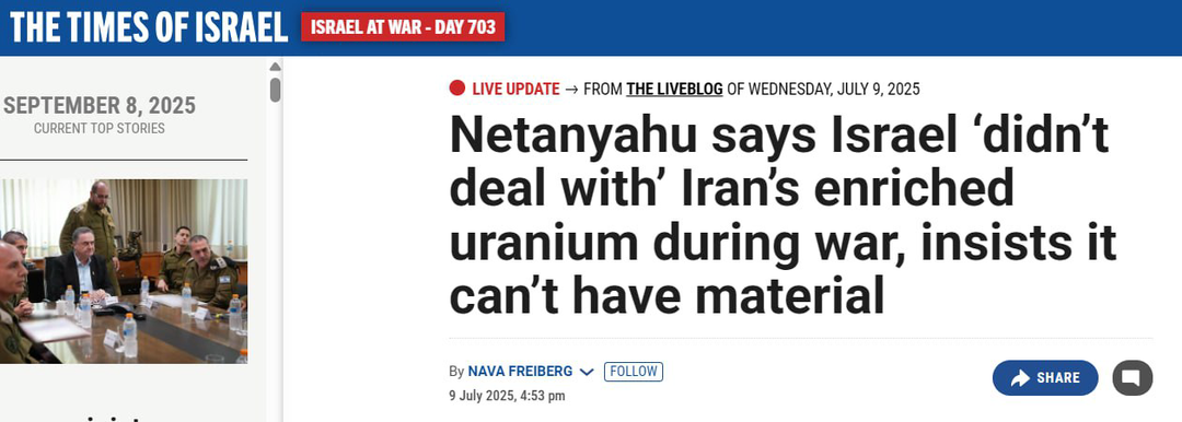 رژیم صهیونیستی از فردای حمله آمریکا به تأسیسات هسته‌ای، بارها از اورانیوم 60 درصدی ایران سخن گفته است. به گزارش تایمز اسرائیل، نتانیاهو می‌گوید: «اسرائیل در طول جنگ با اورانیوم غنی‌شده ایران، سروکار نداشته است.» او اصرار دارد که ایران نمی‌تواند این مواد را داشته باشد. نتانیاهو تاکید کرد: «اسرائیل می‌خواهد که اورانیوم غنی‌شده به‌عنوان یک جز ضروری ساخت بمب اتم، تحت کنترل باشد.»