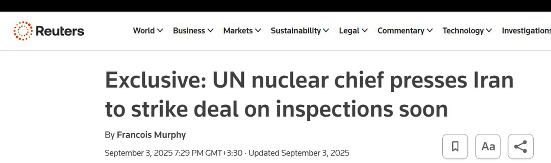 گروه تحلیل بین‌الملل: رافائل گروسی، مدیرکل آژانس بین‌المللی انرژی اتمی در تاریخ 3 سپتامبر(12 شهریور) در مصاحبه‌ای اختصاصی با رویترز گفت: «مذاکرات آژانس با ایران در خصوص از سرگیری بازرسی‌ها، ازجمله بازرسی از سایت‌های هدف گرفته شده توسط آمریکا و اسرائیل، نمی‌تواند ماه‌ها ادامه یابد و خواهان توافق در هفته آتی هستیم.»