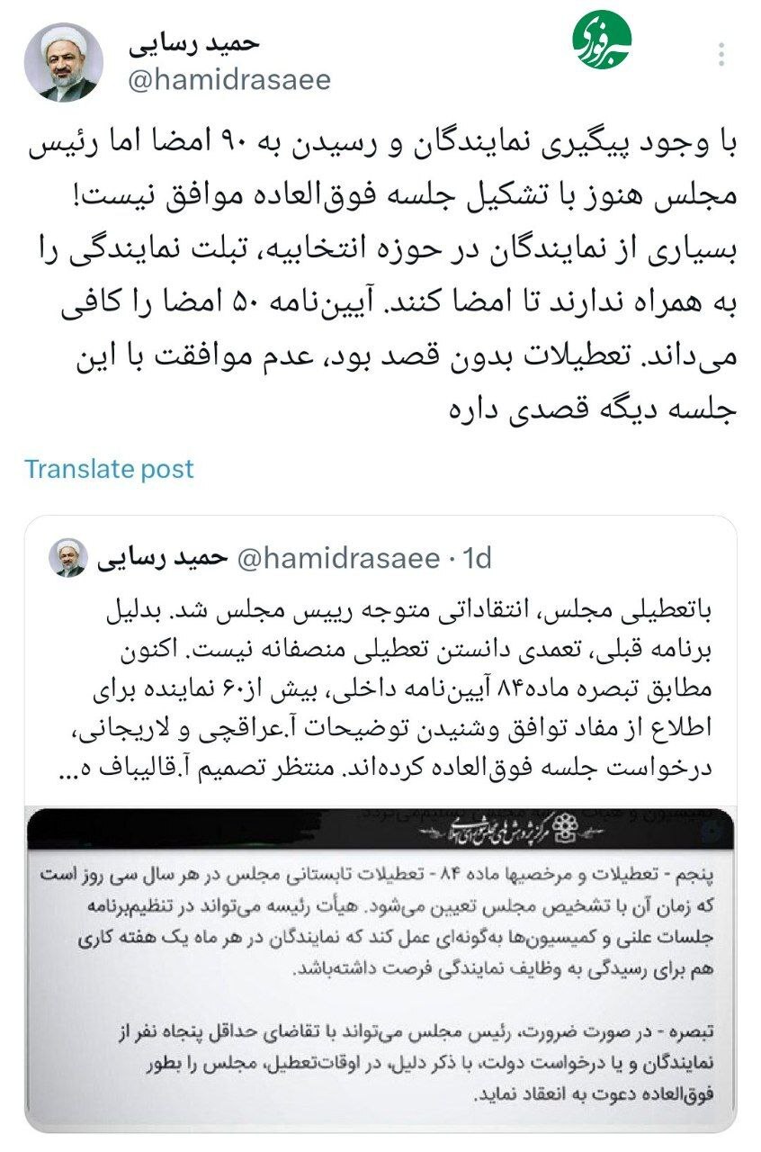 حمید رسایی مدعی شد که ۹۰ نماینده مجلس درخواست برگزاری جلسه فوقالعاده را ارائه کردهاند، اما رئیس مجلس همچنان با این درخواست مخالفت میکند. وی افزود که تعطیلی فعلی مجلس بیقصد تلقی نمیشود.