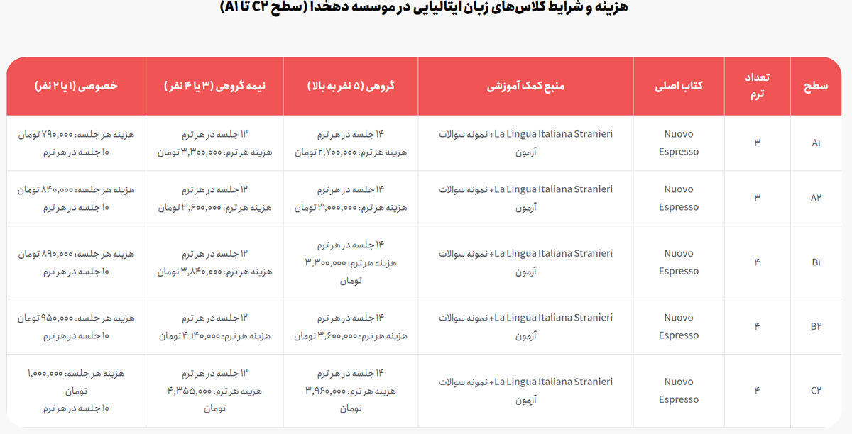 اگر می خوای کلاس زبان ایتالیایی ثبت نام کنی، حتما از دوره های موسسه زبان دهخدا استفاده کن. این موسسه یکی از بهترین آموزشگاه های تهران برای یادگیری زبان ایتالیایی هست که از هر جای ایران به صورت آنلاین یا حضوری می تونی تو کلاس هاش شرکت کنی.