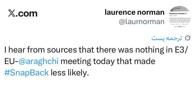 لارنس نورمن خبرنگار وال استریت ژورنال در شبکه اجتماعی ایکس نوشت: در نشست امروز سه کشور اروپایی - اتحادیه اروپا با عراقچی، هیچ چیزی مطرح نشد که احتمال فعالسازی «مکانیسم ماشه» را کمتر کند.