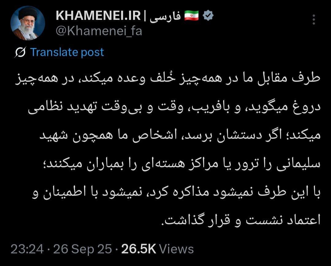 صفحه رهبر انقلاب در ایکس پس از پایان جلسه شورای امنیت درباره فعالسازی مکانیسم ماشه توییتی منتشر کرد. در این توییت نوشته شده است: طرف مقابل ما در همه چیز خلف وعده میکند درهمه چیز دروغ میگوید و با قریب و بی وقت تهدید نظامی میکند. اگر دستشان برسد اشخصا ما همچون شهید سلیمانی را ترور یا مراکز هسته ای را بمباران میکنند با این طرف نمیشود مذاکره کرد نمیشود با اطمینان نشست و قرار گذاشت.