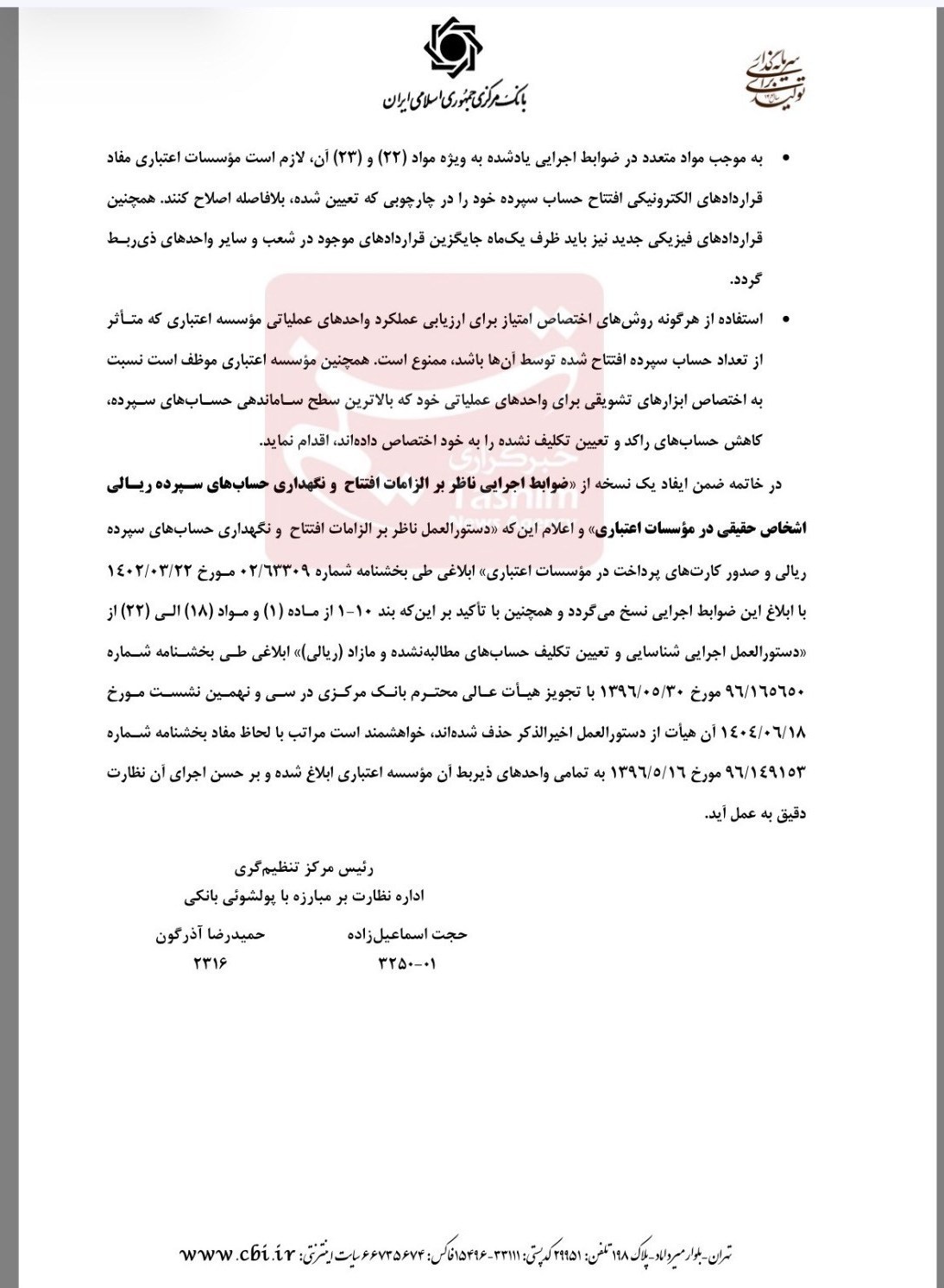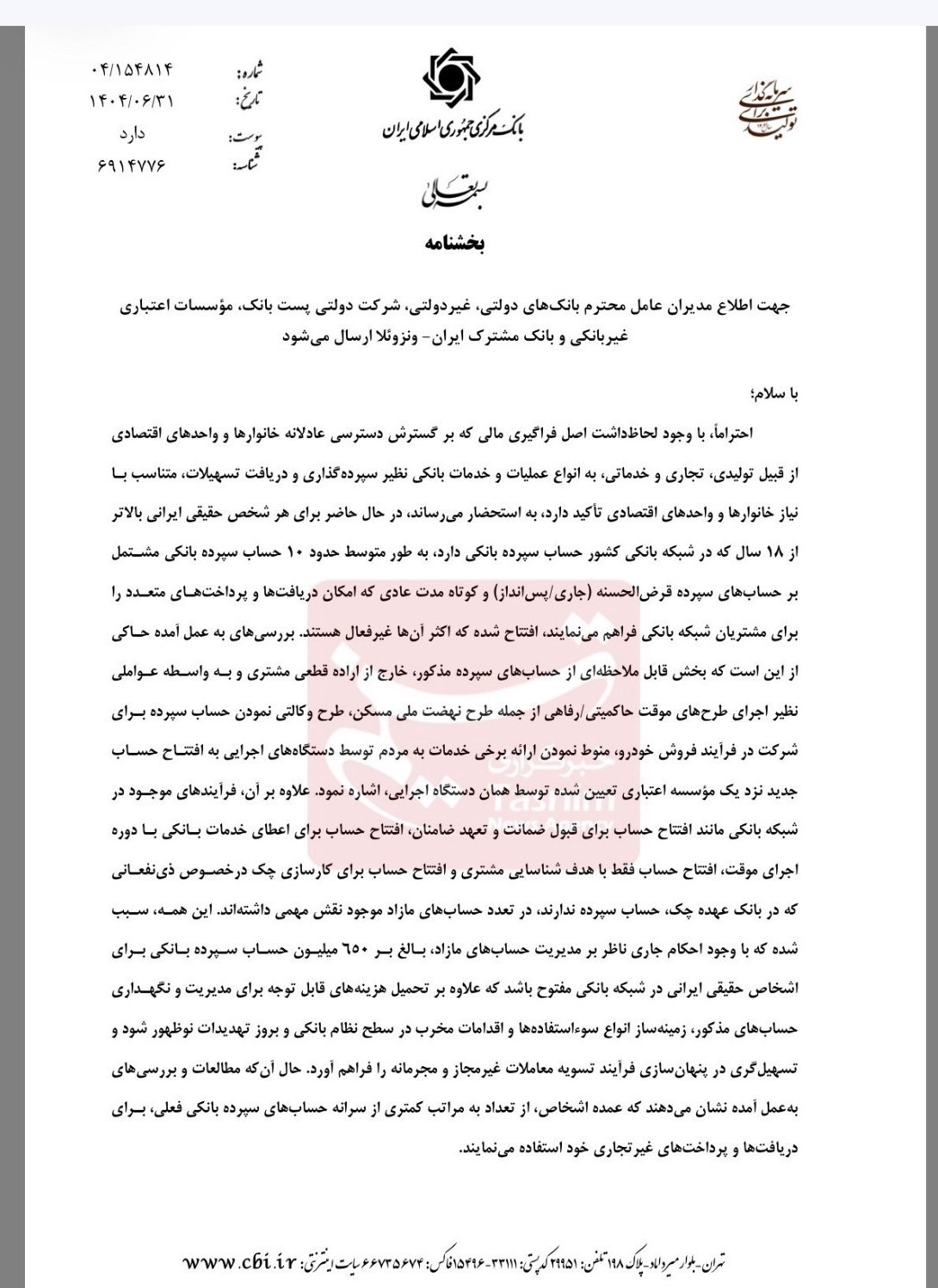 بخشنامه همچنین محدودیت جدی در افتتاح حساب برای کسانی که بیش از 10 حساب فعال دارند یا حساب‌هایشان در سامانه سیاح «تعیین‌تکلیف‌نشده» باقی مانده، اعمال می‌کند.