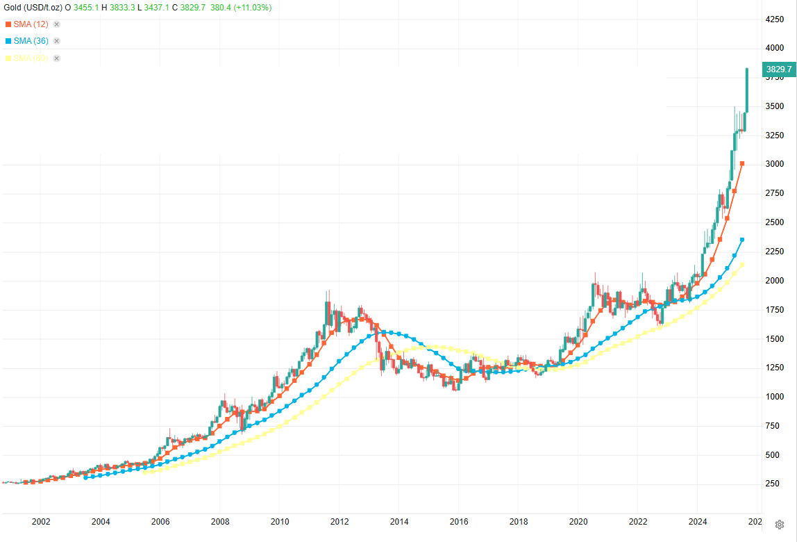 نمودار زیر آخرین موقعیت و تغییرات قیمتی ماهانه اونس طلا را طی ۱۲ سال گذشته در تاریخ ۲۹ سپتامبر ۲۰۲۵ نشان میدهد. نمودارهای قرمز، آبی و زرد به ترتیب میانگین متحرک یک، ۳ و ۵ ساله است. جایی که قیمت در فاصله ۷۰ درصدی از میانگین متحرک ۵ ساله دارد.