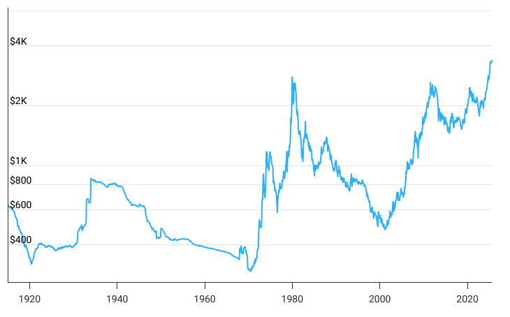 نمودار زیر قیمت اصلاحشده اونس با تورم است و مسیر واقعی قدرت خرید طلا را از دهه ۱۹۲۰ تا امروز به نمایش میگذارد و نشان میدهد که فراز و فرودهای اسمی گذشته، وقتی با اثر تورم تعدیل میشوند، چه جایگاهی در ارزش حقیقی پیدا میکنند.