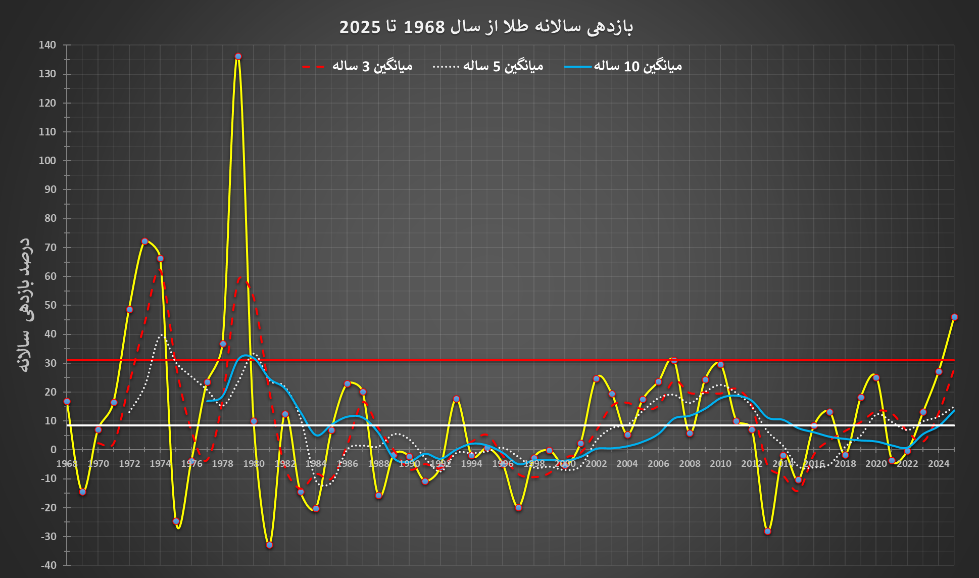 از طرفی میانه بازدهی دوره نیز ۷.۰۵ درصد بوده، به این معنا که در نیمی از سالها رشد سالانه طلا کمتر از این مقدار بوده است.