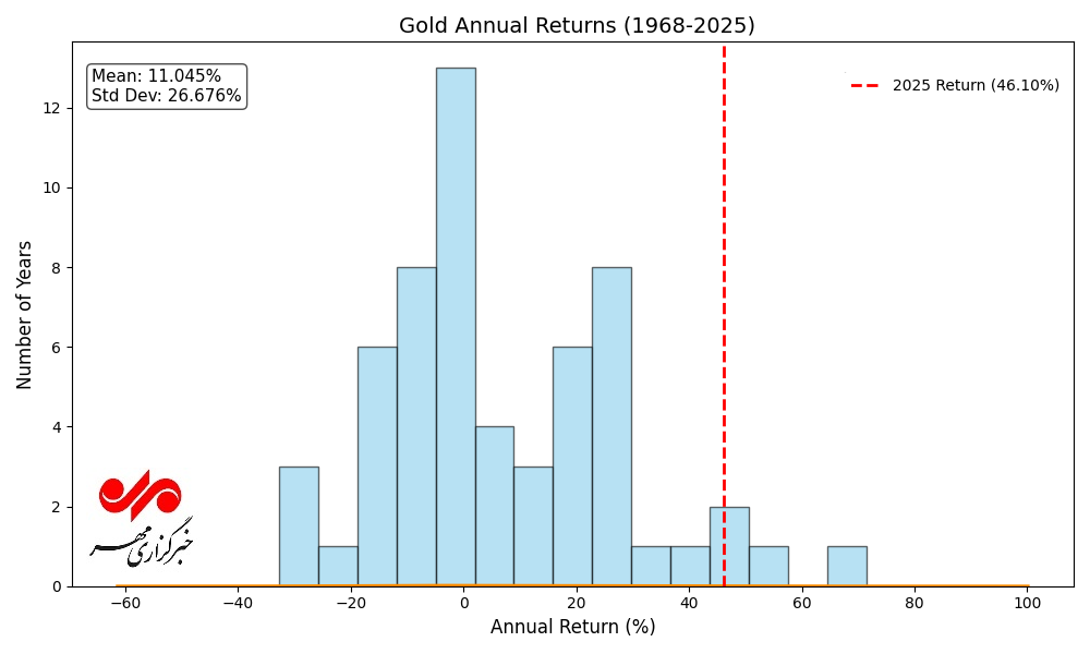 نمودار زیر تعداد سالهای با بازدهی مشخص را از سال ۱۹۶۸ تا ۲۰۲۵ نشان میدهد. محور افقی بیانگر بازدهی سالانه اونس طلا و محور عمودی تعداد سالی که این بازدهی کسب شده را نشان میدهد. میانگین حسابی و انحراف از معیار بازدهی سالانه اونس طلا نیز به ترتیب ۱۱ و ۲۶.۷ درصد است.