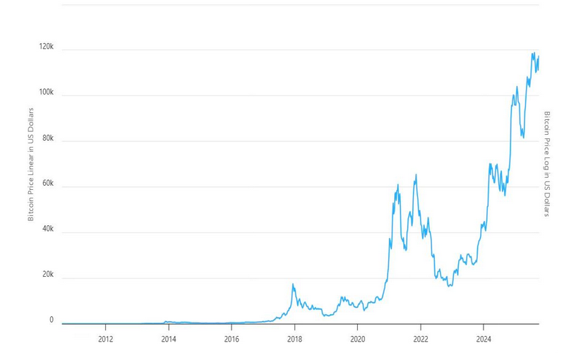 مقایسهی بازدهی تاریخی نشان میدهد که بیت کوین طی ۱۶ سال، رشد نجومی حدود ۱۲۱ میلیون برابری داشته است (از ۰.۰۰۰۹۹ دلار به ۱۲۰,۰۰۰ دلار). در حالی که طلا در همین دوره (از ۸۵۰ دلار به ۳,۸۴۸ دلار) فقط حدود ۴.۵ برابر رشد کرده است. جالب است بدانید که طلا از سال 1833 تا 2025 فقط 192 برابر رشد داشته است.