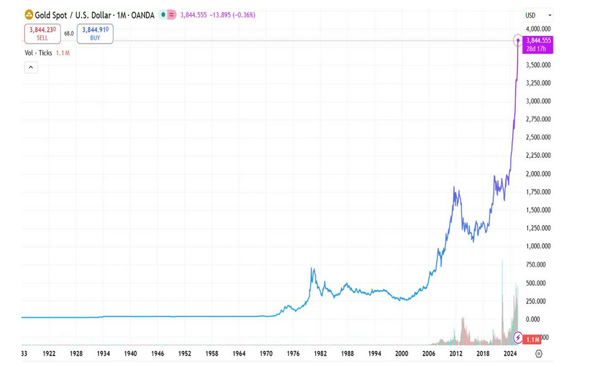 طلا از سالهای ۱۹۰۰ تا اوایل ۱۹۷۰ تقریباً ثابت و نزدیک ۳۵ دلار بود. پس از لغو استاندارد طلا در ۱۹۷۱، طی دهه ۷۰ میلادی تا حدود ۶۵۰ دلار رشد کرد. در سالهای ۱۹۸۰ تا ۲۰۰۰ بین ۲۵۰ تا ۵۰۰ دلار نوسان داشت. از ۲۰۰۰ تا ۲۰۱۱ جهشی تا ۱۸۰۰ دلار ثبت کرد و سپس بین ۲۰۱۲ تا ۲۰۱۸ حدود ۱۰۰۰ تا ۱۳۰۰ دلار معامله شد. در ۲۰۲۰ به ۲۰۰۰ دلار رسید و امروز در ۲۰۲۵ رکورد ۳۸۴8 دلار را تجربه میکند.