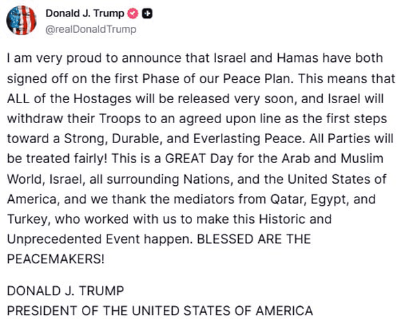 ترامپ در شبکه اجتماعی «تروث سوشال» نوشت که دو طرف بر سر مرحله اول طرح صلح آمریکا به توافق رسیده و گروگانها بهزودی آزاد خواهند شد.