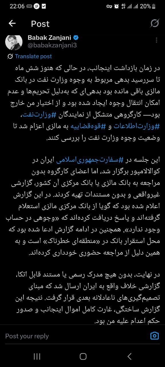 بابک زنجانی برای اولین بار علت اصلی صدور حکم اعدامش را اعلام کرد، زنجانی در شبکه ایکس نوشت: