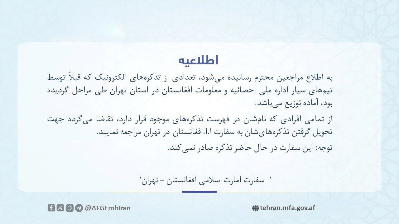 سفارت افغانستان در تهران اعلام کرد که به دلیل شرایط جدید، صدور کارت ملی برای اتباع این کشور متوقف شده و متقاضیان باید منتظر اطلاعیههای بعدی باشند.