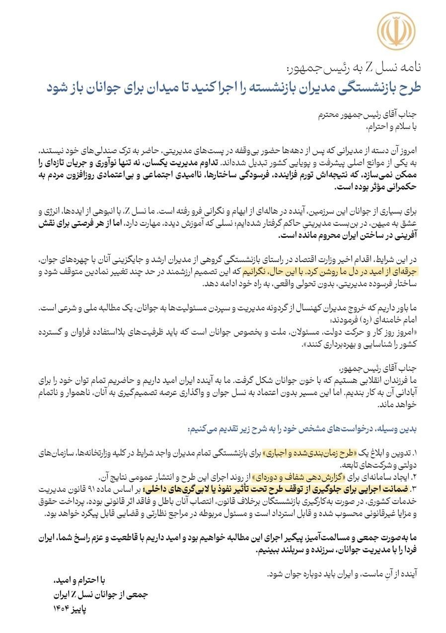 در بخشی از نامه جمعی از جوانان نسل Z به رئیسجمهور آمده است: طرح بازنشستگی مدیران بازنشسته را اجرا کنید تا میدان برای جوانان باز شود.