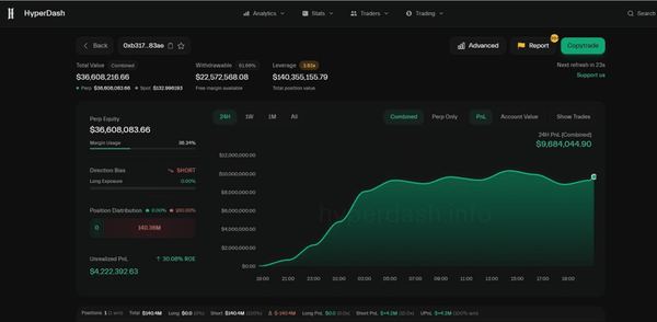 کیف پول فعال پلتفرم HyperDash منتسب به بارون ترامپ، پس از سود ۹۱ میلیون دلاری سهشبه شب، همچنان در حال سود بردن است.