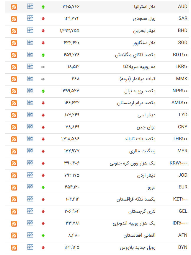 | یوان چین | CNY | ۱۰۰,۸۲۶ | ۱۰۱,۷۴۲ | ۲۰۹ | ۹۷,۸۹۰ | ۹۸,۷۷۹ | ۲۰۳ |