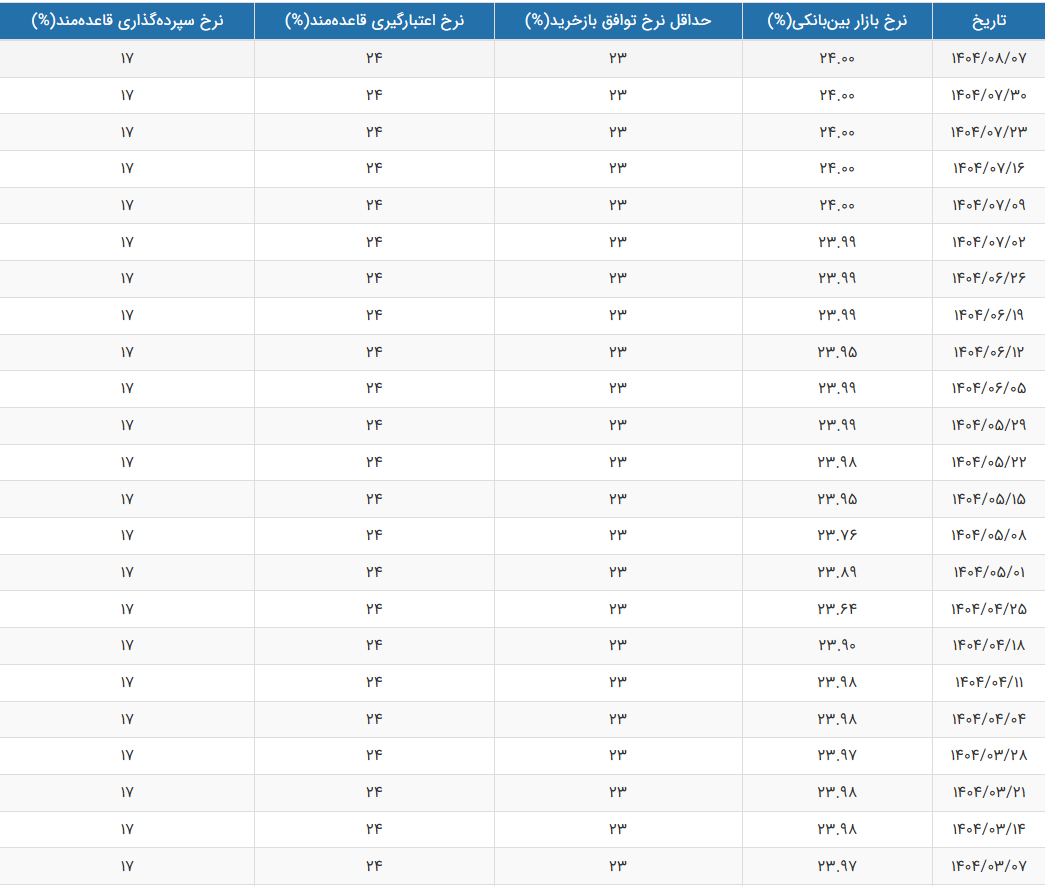 نرخ سود بینبانکی در هفته منتهی به ۷ آبان ۱۴۰۴ برای پنجمین هفته پیاپی در سطح ۲۴ درصد ثابت ماند