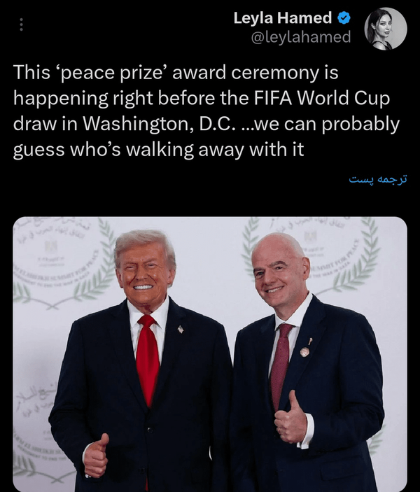 لیلا حامد، خبرنگار مارکا با انتشار عکس رئیس فیفا در کنار ترامپ مینویسد که این مراسم «جایزه صلح» درست قبل از مراسم قرعه کشی جام جهانی در واشنگتن برگزار میشود و احتمالا حدس میزنیم برنده این جایزه چه کسی خواهد بود.